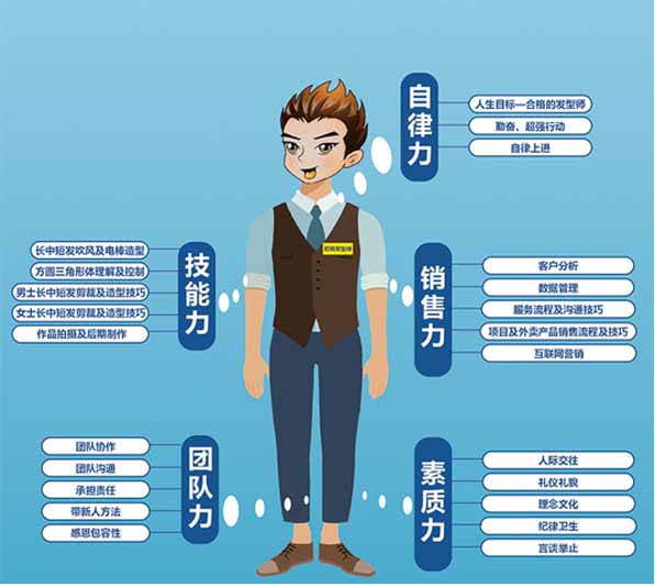 1.掌握全面的发型师基础技术(包括;剪发基础和标准姿势,掌握长中短商业发型吹风技巧,四类基础男士发型剪裁、五款女士商业剪裁烫发与造型)